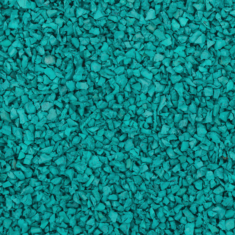 Крашеная крошка цвета морской волны. Получена путем поверхностного окрашивания резиновой черной крошки. Красиво выглядит на детских площадках при создании рисунков морской тематики, а также эффектно сочетается в миксах с голубым цветом.